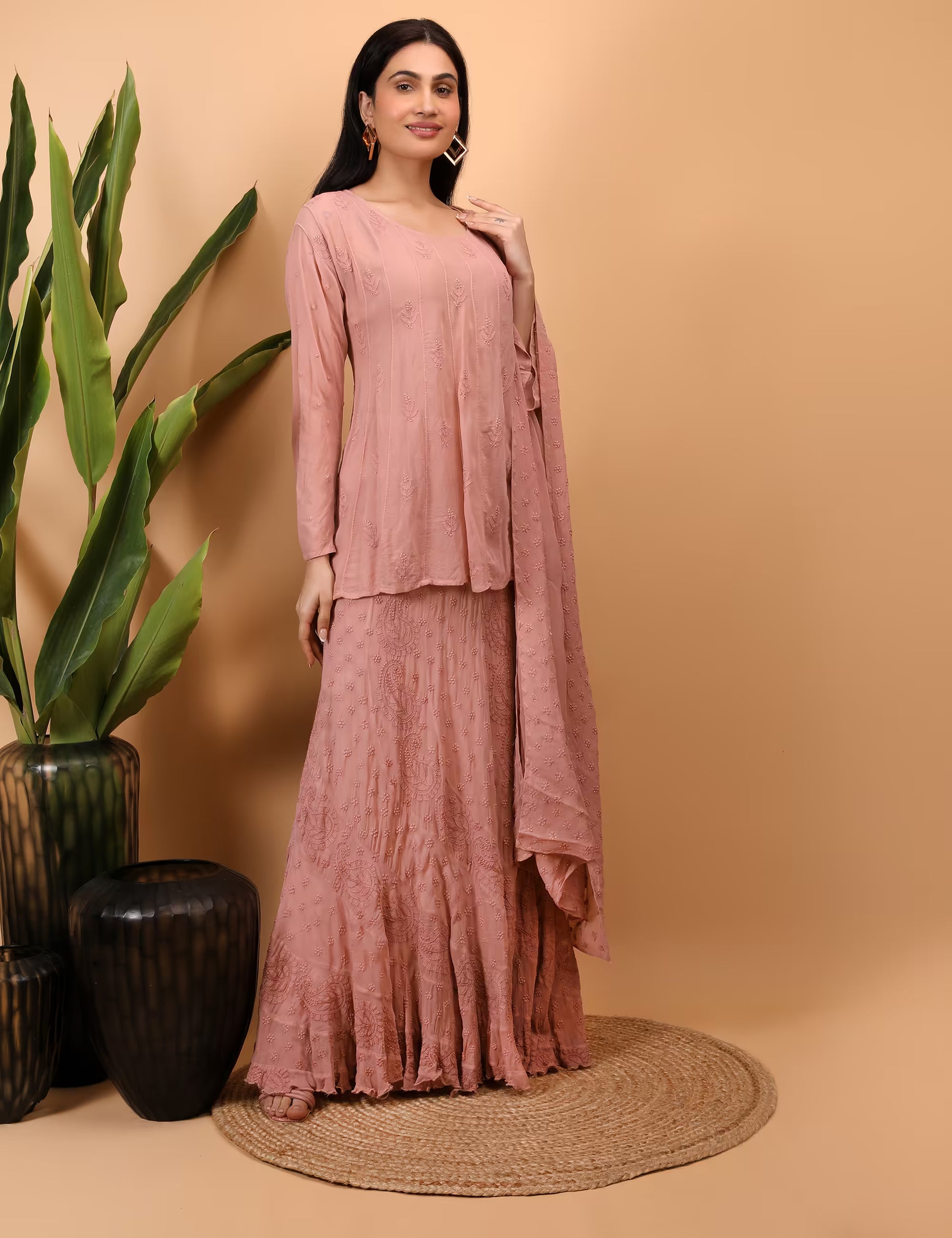 Shwet Women Peach Hand-Embroidered Chikankari Jalebi Lehenga Choli set in fluid georgette, fully lined for comfort and clean fall. The panelled lehenga carries dense spiral/ jalebi cuts with hand embroidered chikankari stitches; the matching top features a round neckline and 3/4th sleeves with coordinated handwork. A lightweight dupatta completes the set.