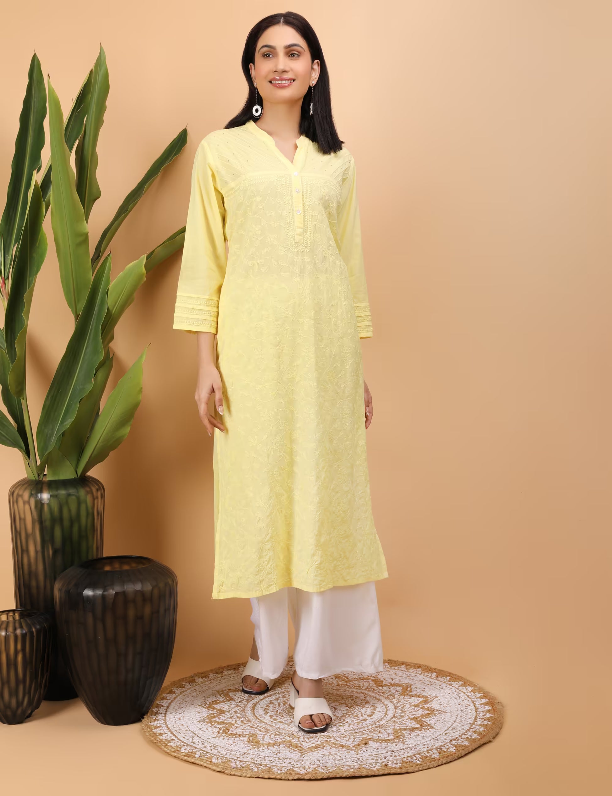 This yellow Chikankari kurta is tailored in soft, breathable Mulmul for all-day comfort. The cheerful hue is elevated by hand-embroidered motifs featuring traditional stitches like Tepchi, Keel and Phanda, creating a play of shadow and texture unique to Lucknow’s heritage craft. Designed with a straight silhouette Collar neckline and 3/4th sleeve for comfortable finish.